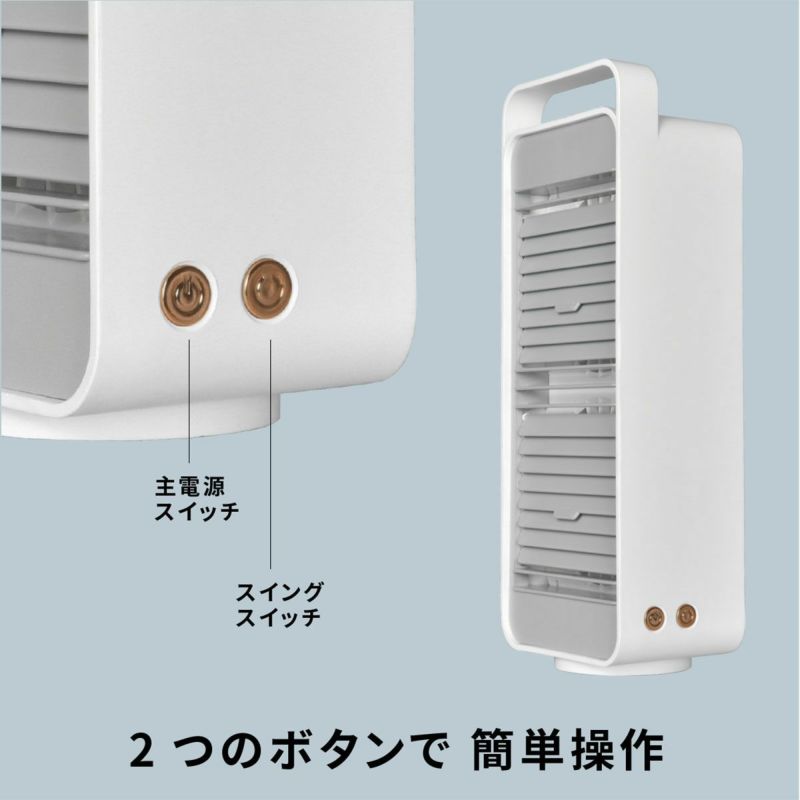 ●スイングできるデスクトップファン。 ●ダブルファン でよりパワフルな風をおくります。 ●二つのボタンで簡単操作。 ●スイングボタンで、土台が回転しスイングします。 ●スリムな形状なので、設置するのも場所をとりません。 ●USB充電で最長4.5時間連続使用可能。 ●風力は3段階調整(弱-中-強)。