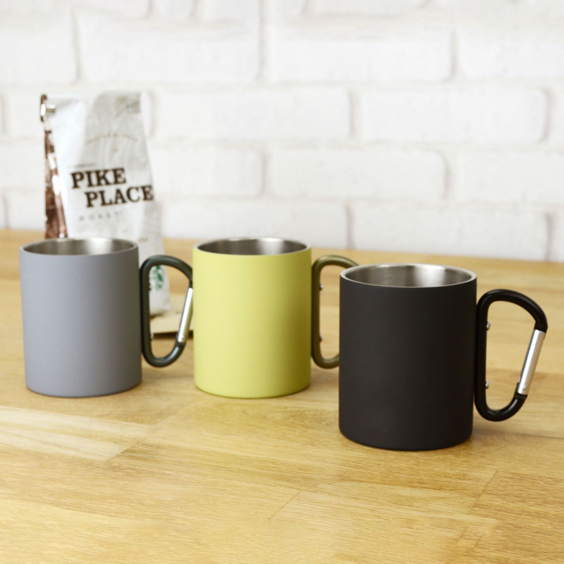 取っ手がカラビナ付きだから、持ち運びしやすい。 350mlの缶がすっぽりはまります。 冷えている飲み物が温まりにくくもなります。 容量:約300ml 【サイズ】 W11xD7.5xH9cm 【本体重量】 115g 【素材】 (本体)ステンレススチール (カラビナ)アルミニウム 【原産国】 中国