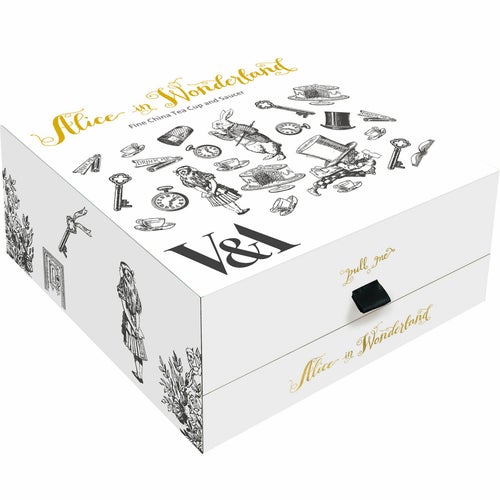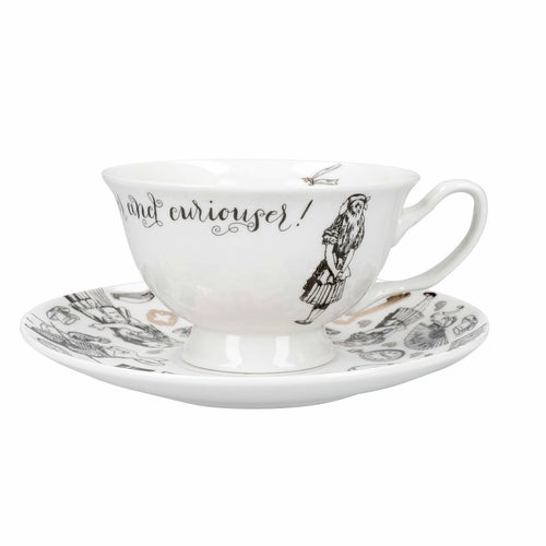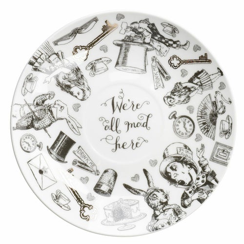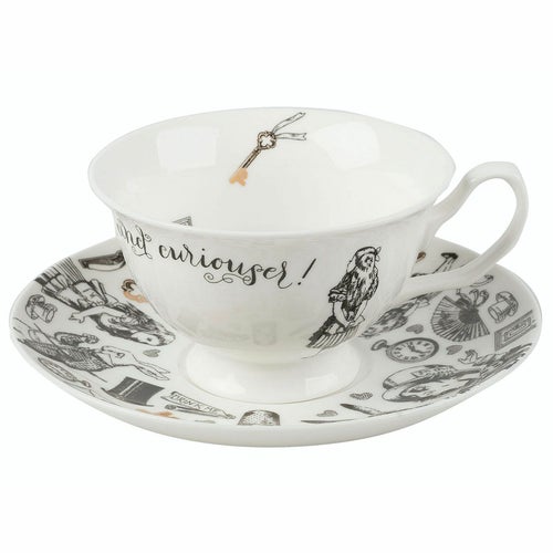 デザインは、サー・ジョン・テニエル(1820年 - 1914年)のアートワークに基づく『アリス・イン・ワンダーランド』のカードゲームからインスパイアされています。ゴールドの装飾が美しいデザインに贅沢なタッチを加え、アイコニックな「curiouser and curiouser(ますます不思議になる)」の引用がティーカップを飾っています。ソーサーの中央には、「we’re all mad here(ここではみんな気が狂っている)」という文言があり、カップから一口飲むまで見えないようになっています。