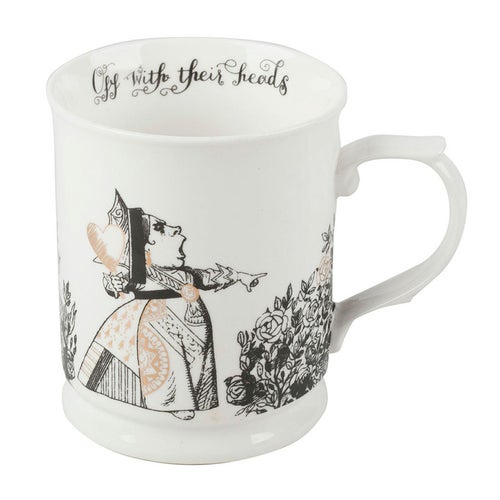 デザインは、サー・ジョン・テニエル(1820年-1914年)のイラストに基づく『アリス・イン・ワンダーランド』のカードゲームに触発されています。女王の有名なコマンド「off with their heads」は、マグの内側のリムに効果的で渦巻くフォントで印刷されています。このアリス・イン・ワンダーランドのマグをひっくり返すと、チュニックを着たまじめな白ウサギが、巻物を持ち、黄金のトランペットを吹いている様子が見つかります。