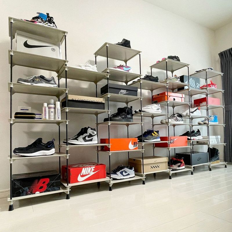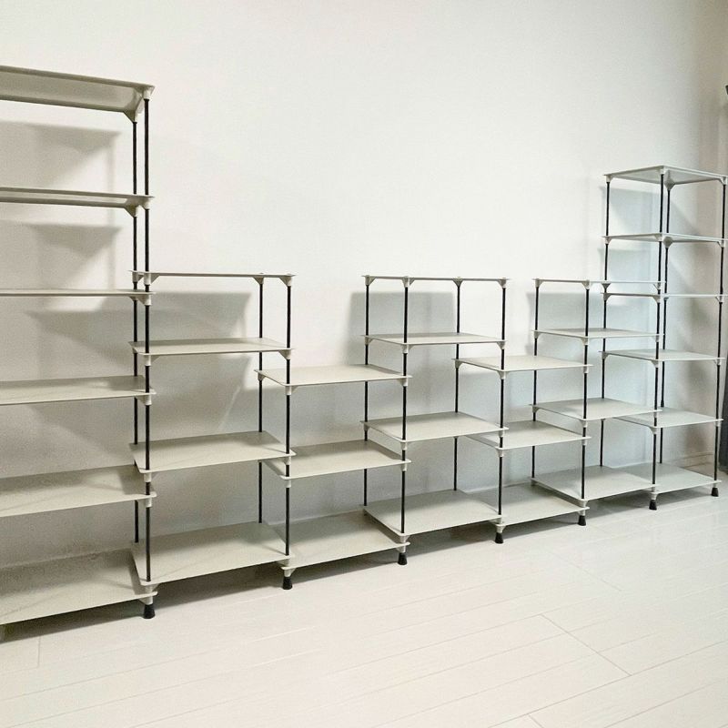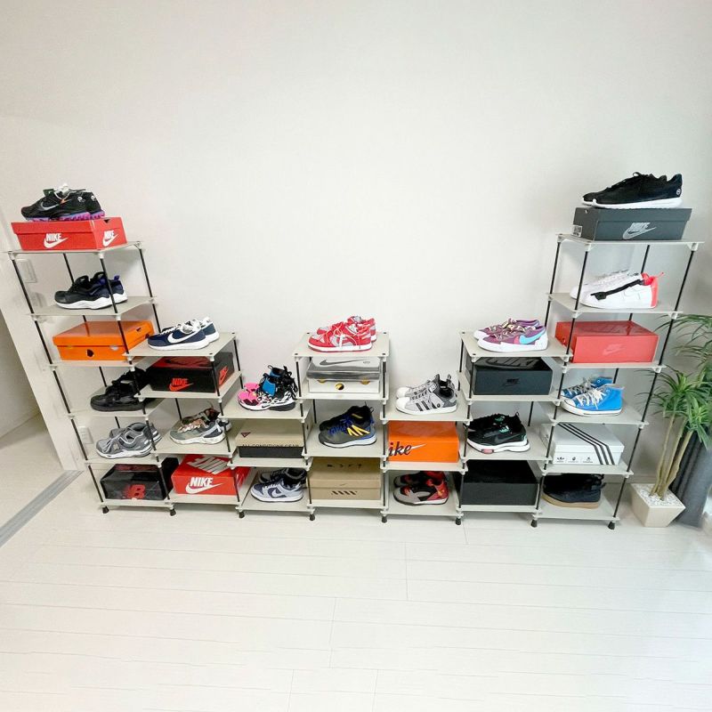横にも縦にも組み合わせ方が自由自在なディスプレイラック。 棚のサイズ約40×30cmで高さは収納するものによって調整できます。 スニーカーだけでなく、スニーカーボックスも合わせてディスプレイできます。 また、お気に入りの小物や観葉植物もディスプレイでき、幅広いシーンでご使用いただけます。 別売のポールやプレートと組み合わせることで、棚数やポールの数を調整することができます。 【セット内容】 ・棚板×7枚 ・ポール×10本 ・キャップ×6個 ・テーパードスリーブ×56個(28セット) ・ワッシャー×6個 ・脚×6個