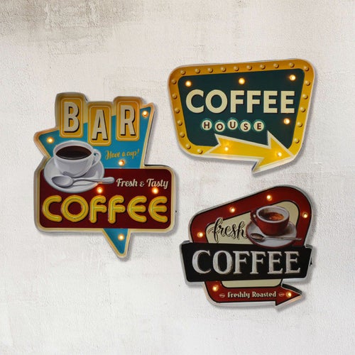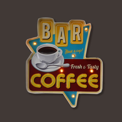 レトロな雰囲気が楽しめる、フォトジェニックなLED付ティンサイン。 ひとつひとつハンドメイドで作られた味があり、ヴィンテージ感のあるアイテムです。 凹凸があるため、立体感もあり、まるで海外のカフェやバーの看板のような雰囲気を醸し出します。 豆電球のように見えるライトは全てLEDライトで、豆電球を一つ一つ取り替える必要がありません。 また、右側面にあるスイッチでLEDライトのON/OFFが簡単に切り替え可能です。 単三乾電池2本でLEDライトを楽しめます。 ※乾電池、壁掛け用のネジなどは付属しておりません。