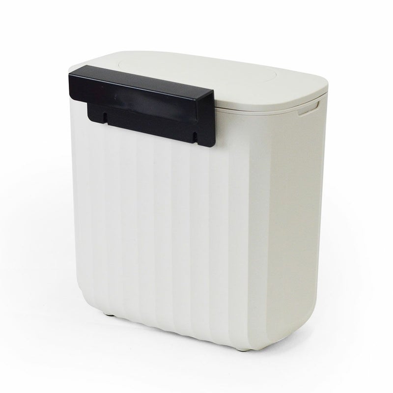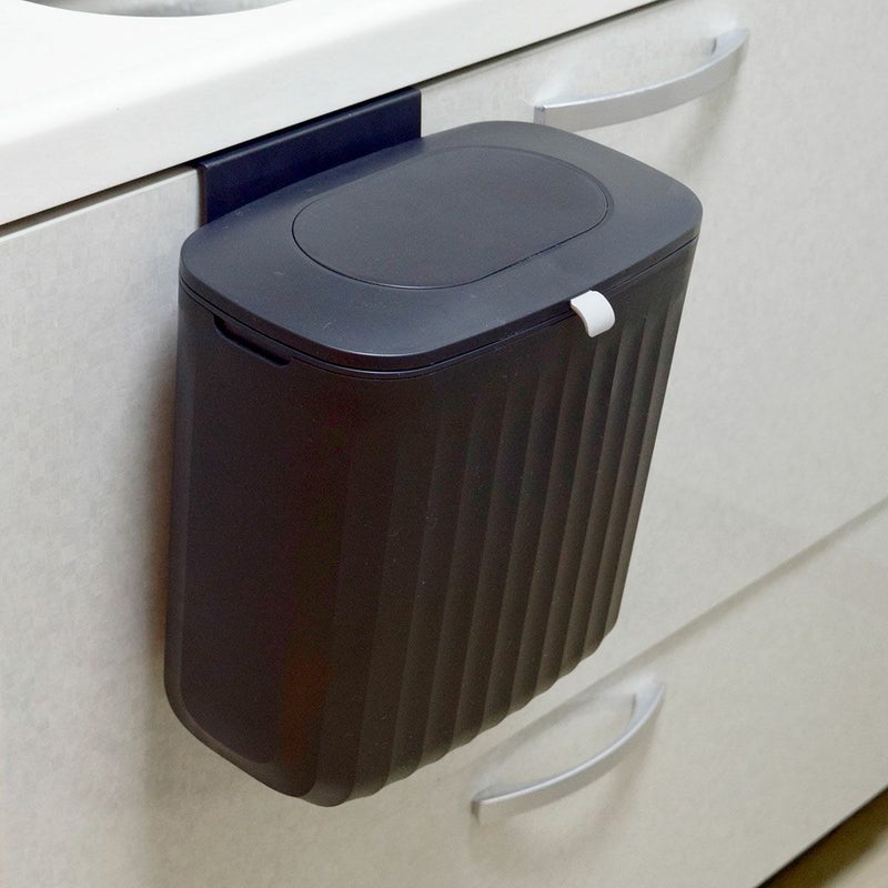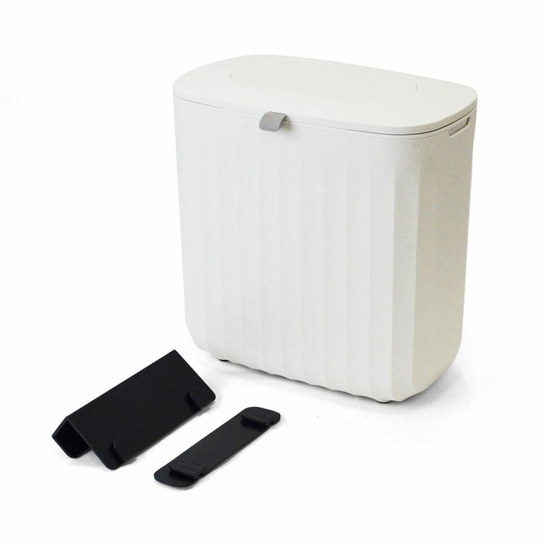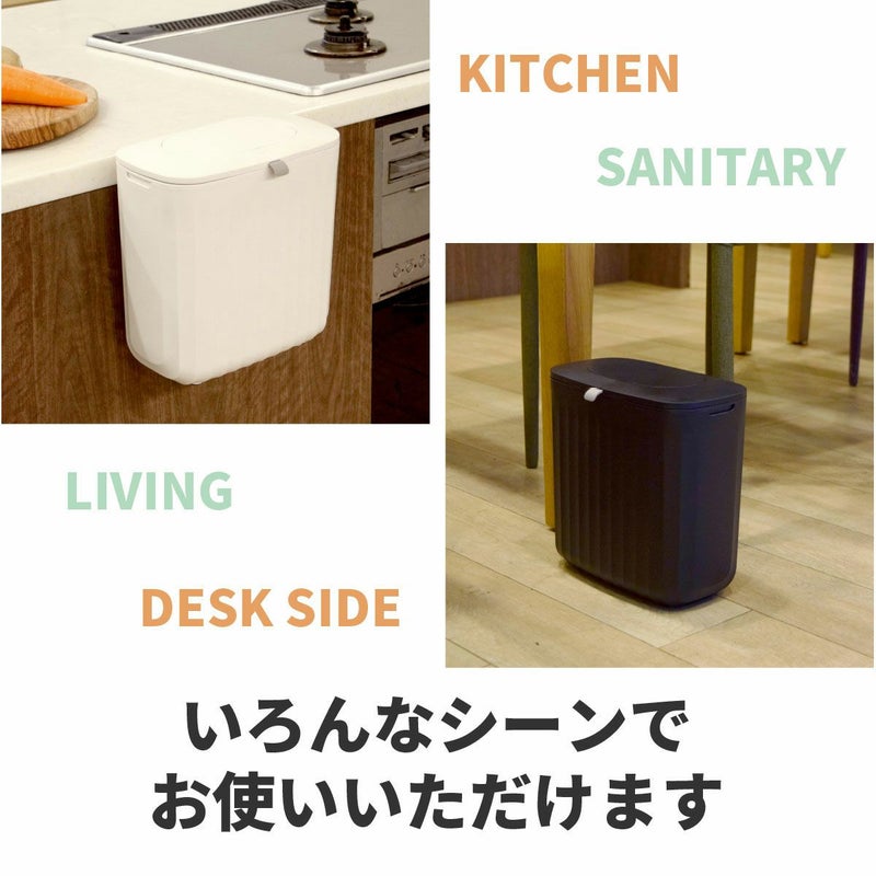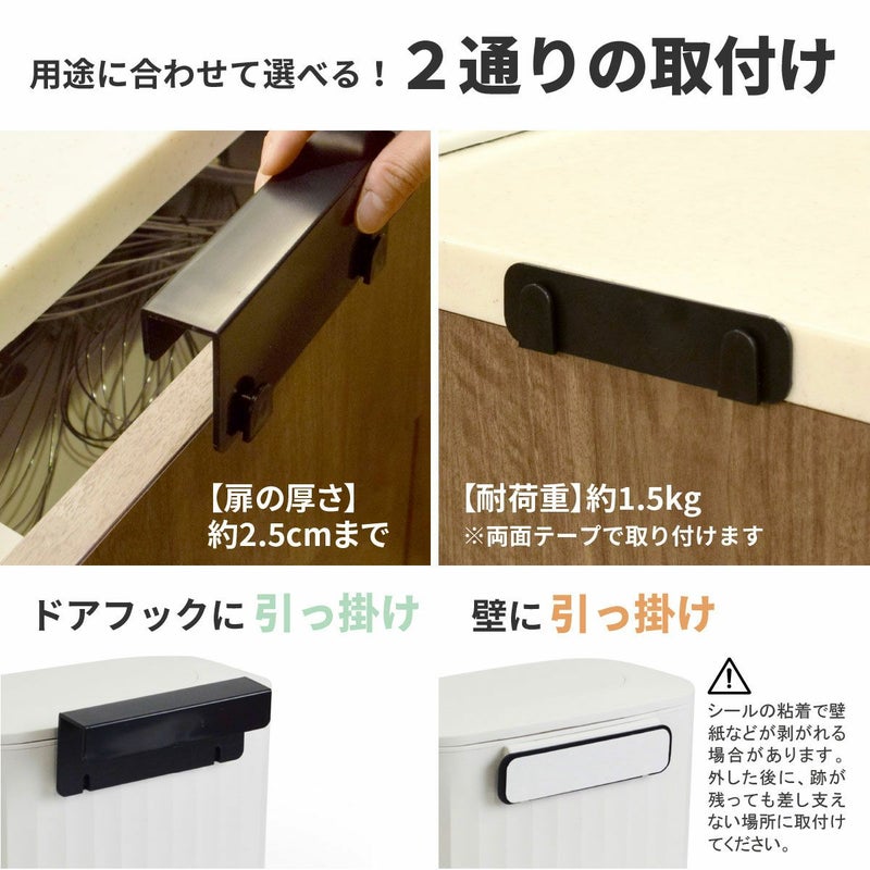 フタの開き方が2通りのダストボックス。 アジャスターを使い分けることで、キッチン扉に設置したり、両面テープで壁面に取り付けることも可能です。 両面テープでのアジャスターを使用した場合は、耐荷重約1.5kgです。 ドアフック用アジャスターを使用する場合は、厚さ2.5cmまでの扉に対応しています。 袋留め付きで、フタを閉めたときに袋が外から見えません。 容量7Lなので、キッチンのドアに取り付けて生ゴミ用のダストボックスや、デスク周り、洗面所、トイレなど幅広くご使用いただけます。