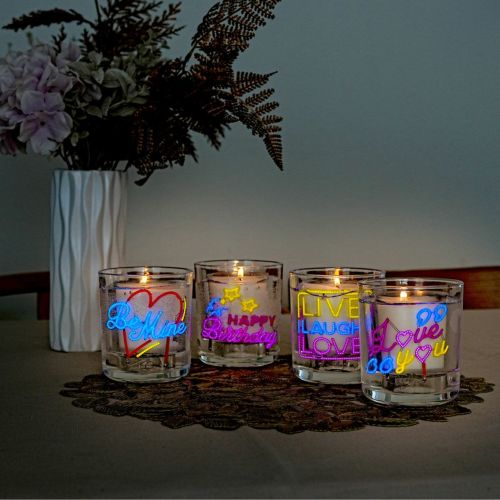 ガラスジャーに入ったキャンドルは、カラフルなメッセージで目を引くデザイン。それぞれのデザインがクールなネオンフラッシュでライトアップされ、ムードを一層華やかに演出します。光センサーが感知するたび、あなただけのメッセージが輝き出します。使い切りタイプで、思い出とともにそっと消える儚さも魅力のひとつ。ギフトボックス入りで、大切な人への贈り物にもおすすめです。