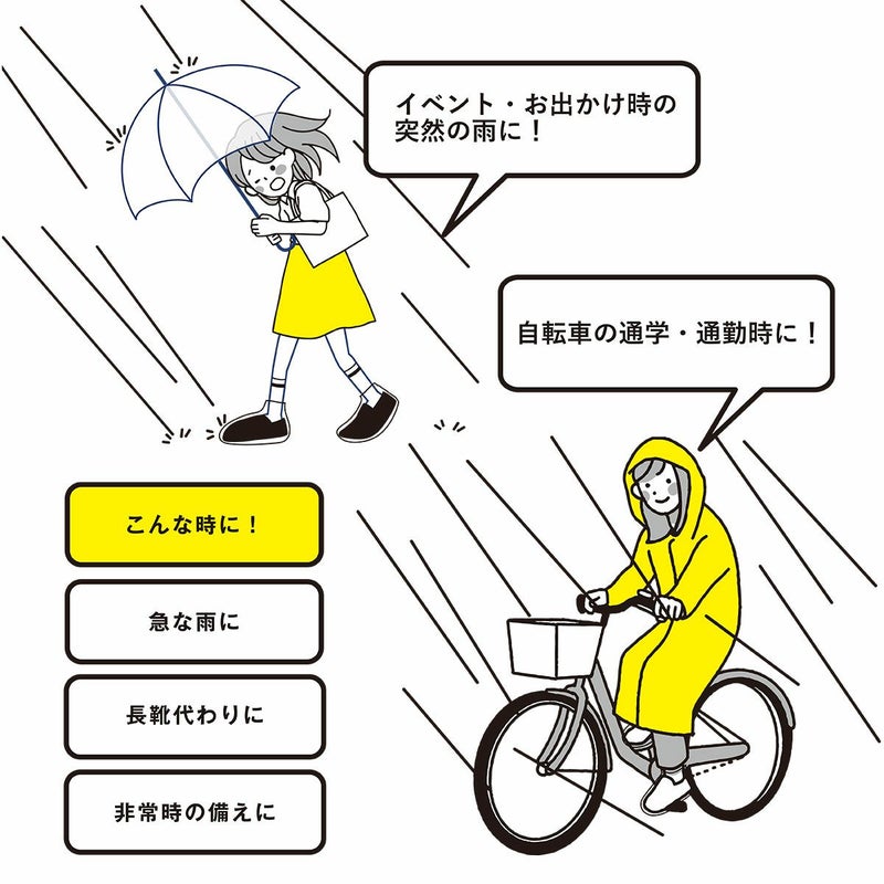 イベントやお出かけ時の突然の雨、自転車での通学・通勤中の急な降り出しにも。