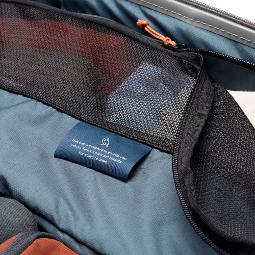 ●ポストコンシューマーリサイクル原料を80%使用したマットポリカーボネートシェルのボディ、リサイクルポリエステル製リップストップの内装生地