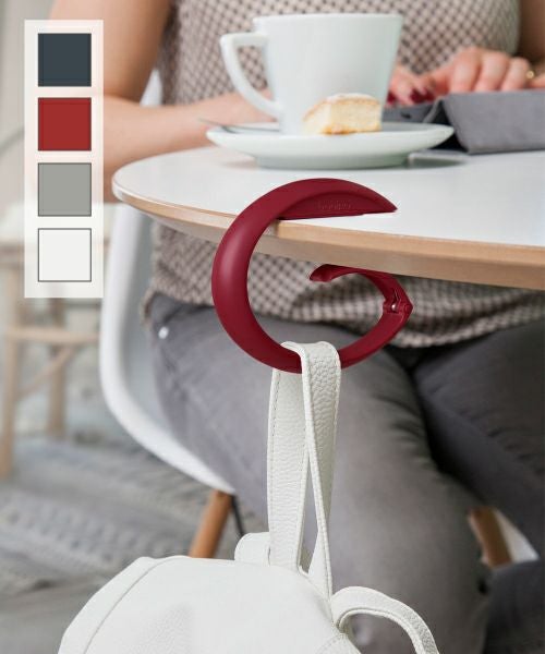 テーブルに引っ掛けて荷物かけ、椅子とバッグを繋いでずり落ち防止、自転車のハンドル部分に付ければ盗難防止としても役立つバックフックです。 ※設置の厚さ:3.5cmまでに対応しています。 ※耐荷重25kg