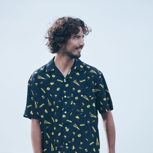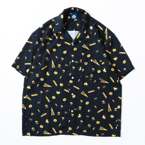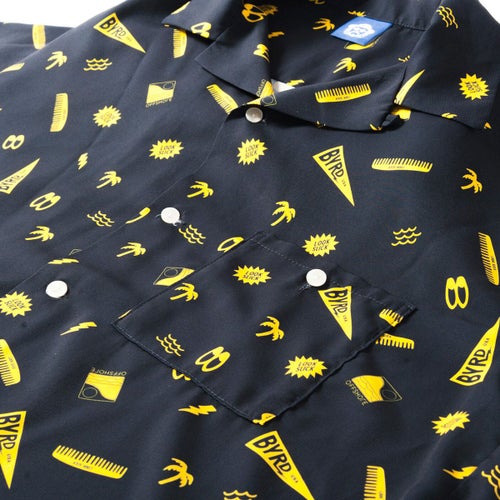 BYRDロゴとオフショアアイコンロゴをベースにコームやパームツリー、ウェーブなどブランドのキーワードアイコンを散りばめたアロハシャツ。