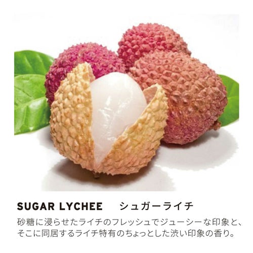 砂糖に浸らせたライチのフレッシュでジューシーな印象と、そこに同居するライチ特有のちょっとした渋い印象の香り。