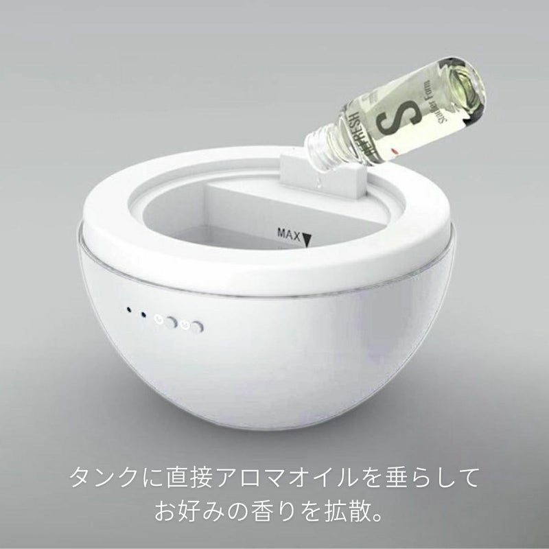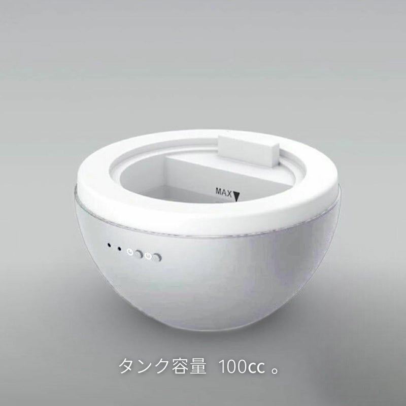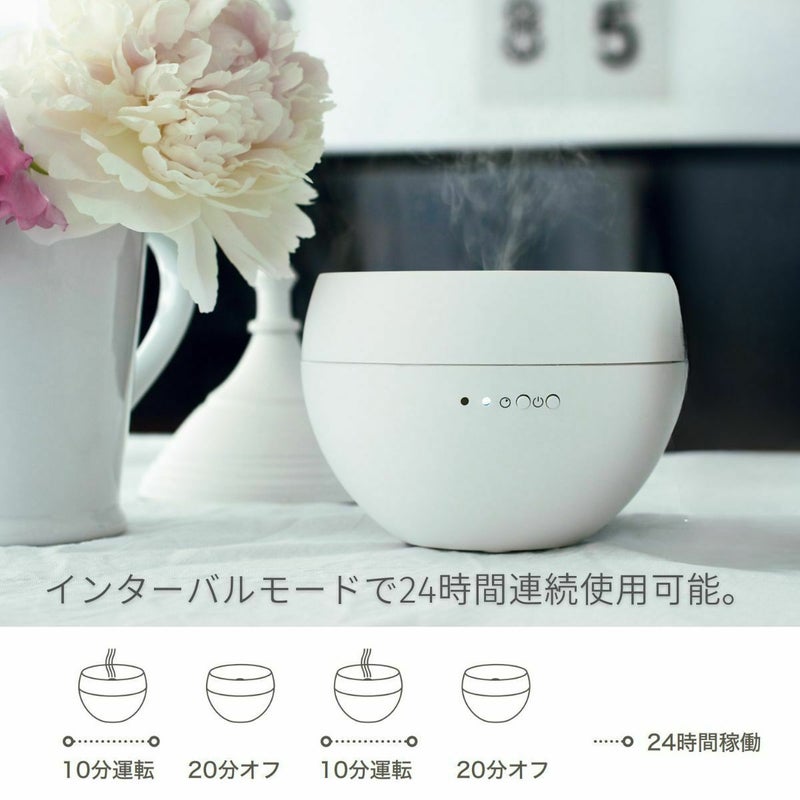 連続稼働約8 時間の超音波式アロマディフュー ザー。インターバルモードを搭載し、間隔をあける ことで連続運転より長時間稼働します。10 分運 転、20 分電源オフ、10 分運転の間隔で稼働し、 24 時間連続でご使用いただけます。 スタイリッシュなアロマディフューザー。 アロマオイルたった2滴で、お好みの香りが24時間持続。 消費電力:7.2W OFF-ON -インターバル機能付き(10分の運転後20分の停止の機能) 連続運転時間:ノーマル…8時間 インターバル…24時間 タンク容量…100ml