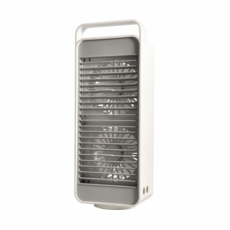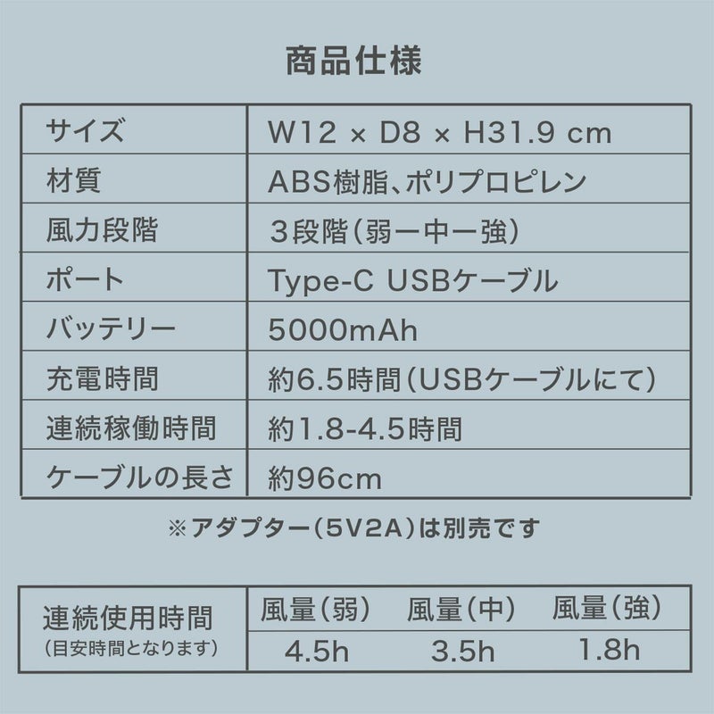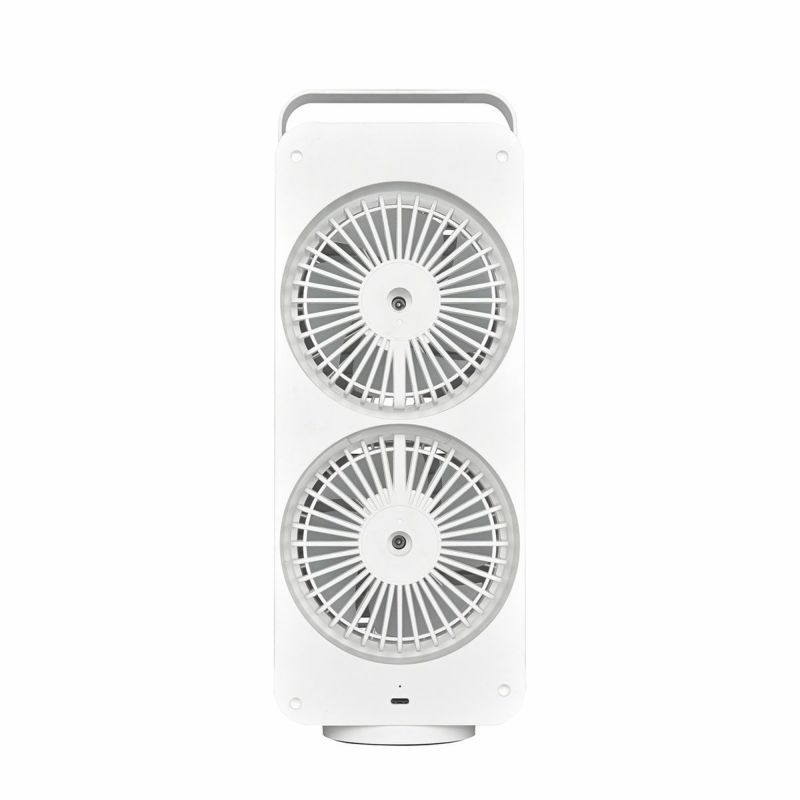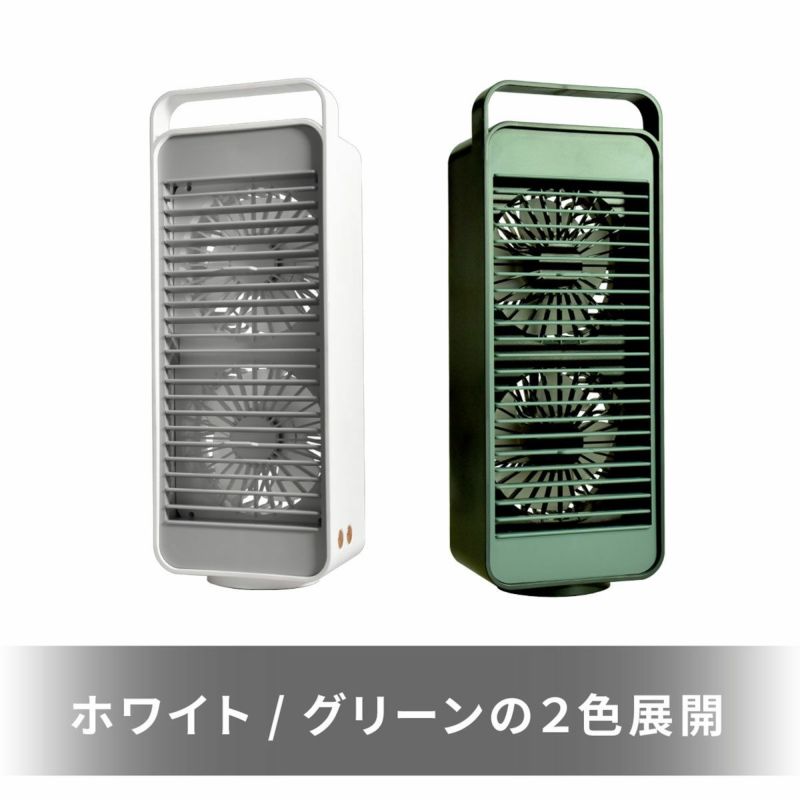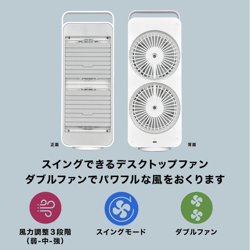 ●スイングできるデスクトップファン。 ●ダブルファン でよりパワフルな風をおくります。 ●二つのボタンで簡単操作。 ●スイングボタンで、土台が回転しスイングします。 ●スリムな形状なので、設置するのも場所をとりません。 ●USB充電で最長4.5時間連続使用可能。 ●風力は3段階調整(弱-中-強)。
