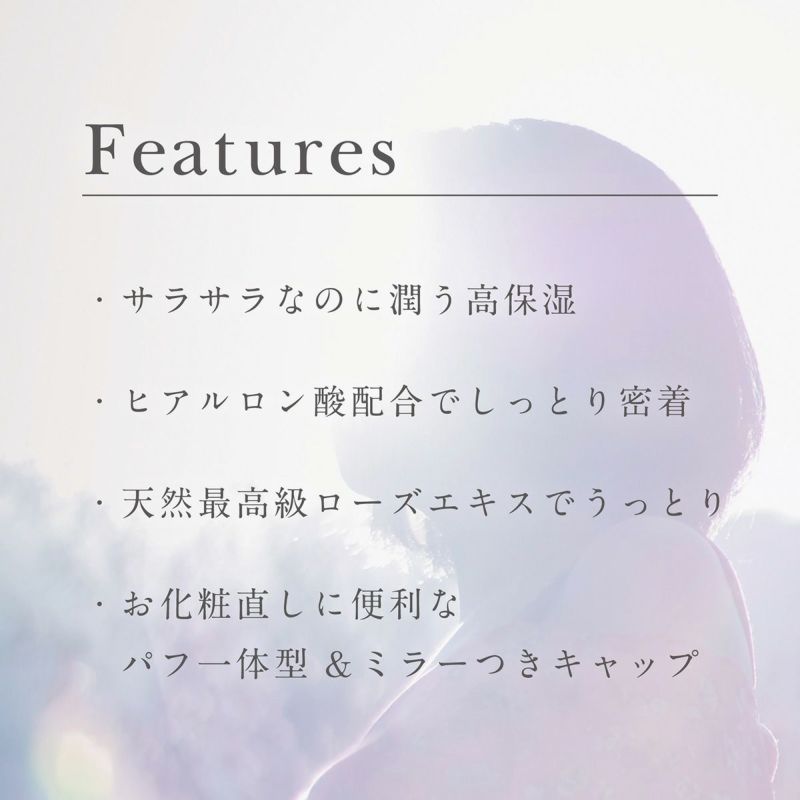 どこでも使えて超カンタン!メイクの上からUVカット(SPF50/PA+++) ヒアルロン酸Na(保湿成分)配合でさらさらなのにしっとりお肌を潤すルースパウダーです。 SPF50/PA+++と高い日焼け止め効果!カットしながら、色ムラやくすみをカバーし、毛穴レスの透明肌(メイクアップ効果による)に! 女性の美しさを引き出すといわれているローズの香り(ダマスクバラ花油)もついているため、つけるたびにふんわりと優しく香ります。 鏡付きのポンポン容器なため、持ち運びが便利で外出時のお化粧直しも簡単にできます。 【ご使用方法】 専用のパフで軽くおさえるように少しずつなじませます。