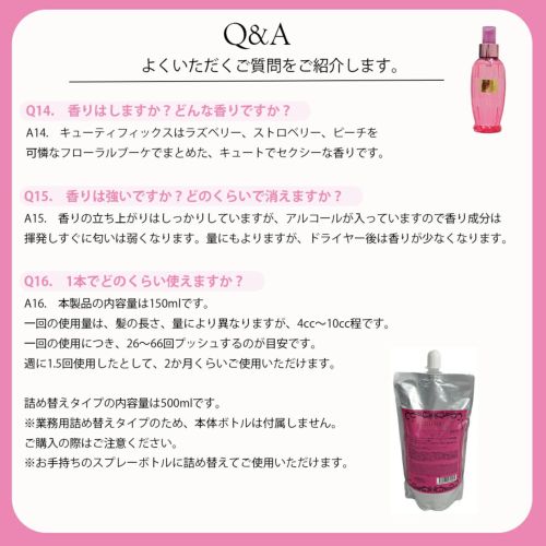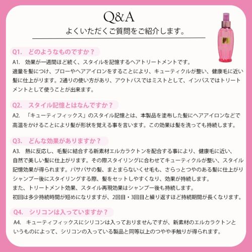 その後、軽く流してください。キューティFIXをスプレー後、いつもお使いのコンディショナーをお使いいただいても効果的です。