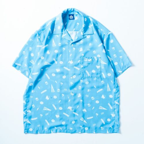 BYRDロゴとオフショアアイコンロゴをベースにコームやパームツリー、ウェーブなどブランドのキーワードアイコンを散りばめたアロハシャツ。