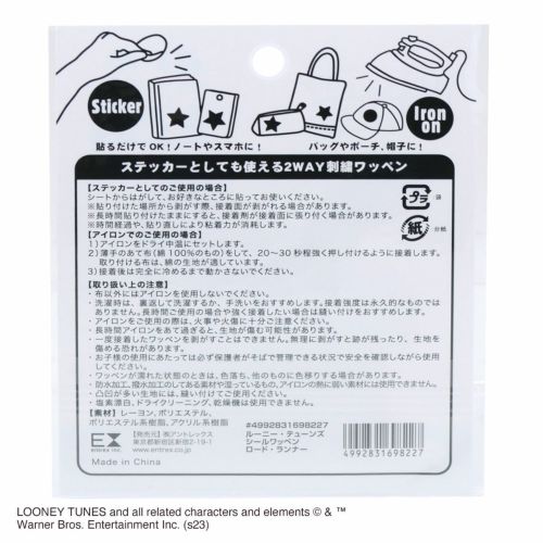 アニメ「ルーニー・テューンズ」に登場する、『Beep!Beep!」というクラクションのような声がしたかと思うと稲妻のごとく走り去って行く「ロード・ランナー」。 どんな不利な状況下におかれても、幸運を引きつける無限のエネルギーで、いかなる時も切り抜けています。 好きなところにペタッと貼って気軽に楽しめるシールみたいな ワッペンが登場! アイロンをかければ布にしっかりくっつく2WAY仕様♪ 対象年齢6歳以上