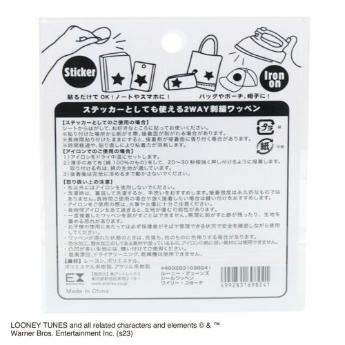 アニメ「ルーニー・テューンズ」に登場する、輝ける発明家!?その才能を活かし、生きがいともいうべき、唯一の目的であるロード・ランナー生け捕り兵器を発明する「コヨーテ」 毎回必ず痛い目に会うけれど、決して諦めないNever Give Up 精神の持ち主です。 好きなところにペタッと貼って気軽に楽しめるシールみたいな ワッペンが登場! アイロンをかければ布にしっかりくっつく2WAY仕様♪ 対象年齢6歳以上
