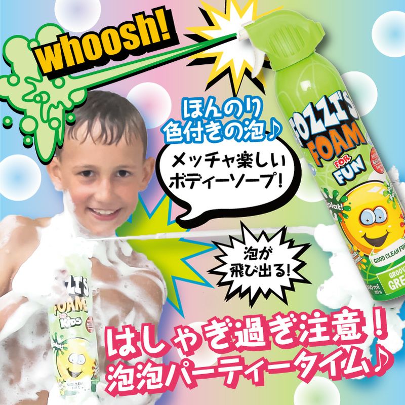 お風呂で遊ぼう! 泡が飛びでる! メッチャ楽しいボディーソープ! トリガー式で水鉄砲みたく泡ソープが飛び出します。 バブルガム 泡の色:ほんのりブルー バブルガムの香り ストロベリー 泡の色:ほんのりピンク ストロベリーの香り グリーンアップル 泡の色:ほんのりグリーン グリーンアップルの香り バナナ 泡の色:ほんのりイエロー バナナの香り グレープ 泡の色:ほんのりパープル グレープの香り オレンジ 泡の色:ほんのりオレンジ オレンジの香り 【使い方】 ① 使用前に容器をよく振ってください。 ② ハンドル(トリガー)を引くと、泡ソープが飛び出します。