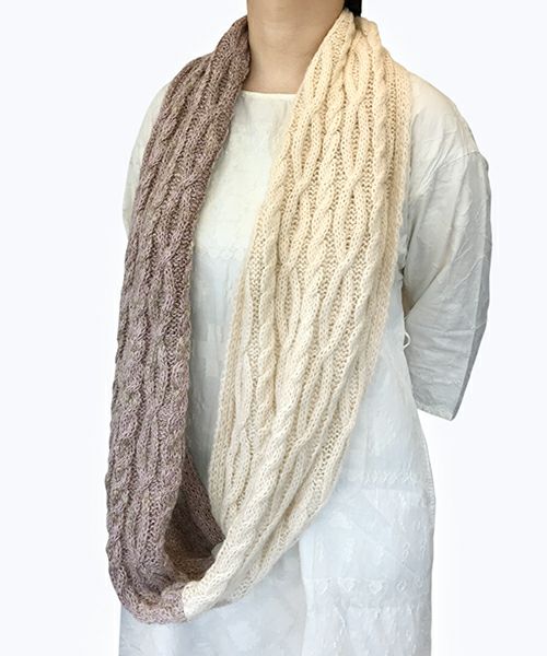 縄編みのヴィンテージニットを繋ぎ合わせたような多面性があるスヌードをデザインしました。片側だけにスラブ糸を使用した2ブロックのスヌードのため、巻いた時に2種類の編み地とカラーの混ざり合いを楽しめます。