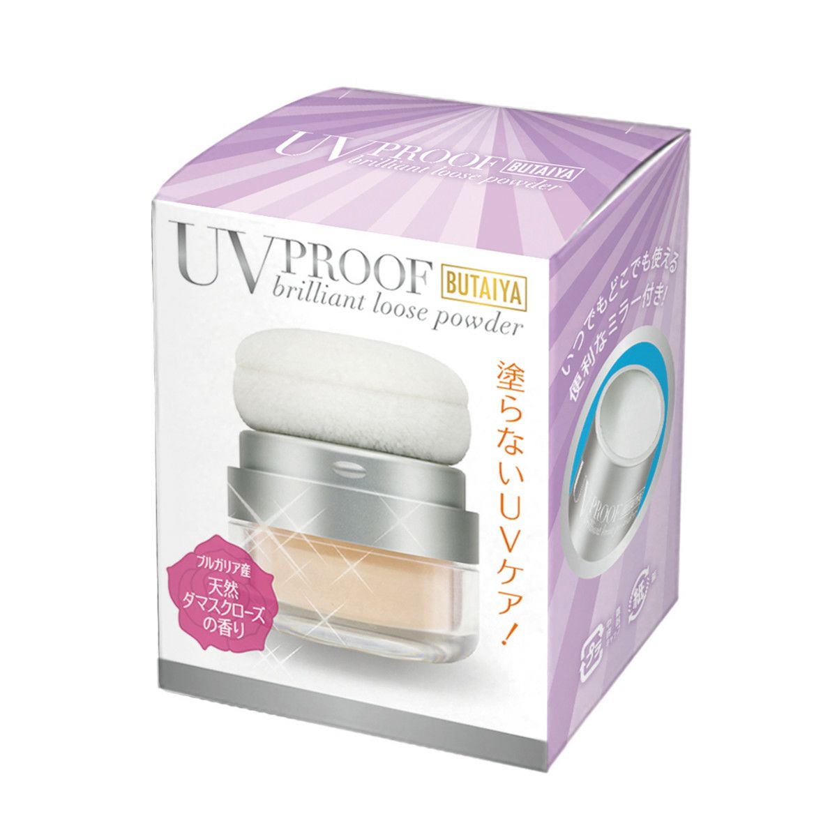 どこでも使えて超カンタン!メイクの上からUVカット(SPF50/PA+++) ヒアルロン酸Na(保湿成分)配合でさらさらなのにしっとりお肌を潤すルースパウダーです。 SPF50/PA+++と高い日焼け止め効果!カットしながら、色ムラやくすみをカバーし、毛穴レスの透明肌(メイクアップ効果による)に! 女性の美しさを引き出すといわれているローズの香り(ダマスクバラ花油)もついているため、つけるたびにふんわりと優しく香ります。 鏡付きのポンポン容器なため、持ち運びが便利で外出時のお化粧直しも簡単にできます。 【ご使用方法】 専用のパフで軽くおさえるように少しずつなじませます。