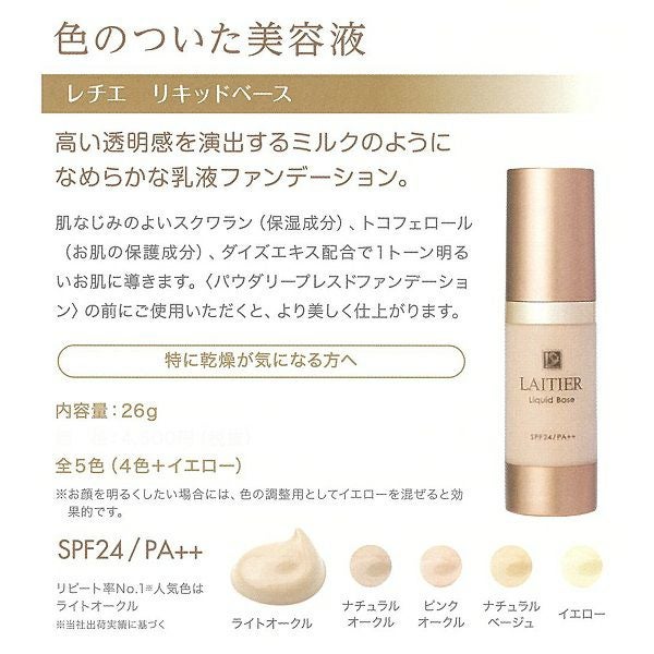 「色のついた美容液」 高い透明感を演出するミルクのようになめらかな乳液ファンデーション。 肌なじみのよいスクワランオイル(保湿)、ビタミンE(製品の抗酸化剤)、ダイズエキス(保湿)配合でメイク効果により1トーン明るいお肌に導きます。 (SPF24 PA++) ※スクワランオイル:スクワラン ※ビタミンE:トコフェロール ※ダイズエキス:ナットウガム 使用方法 お使いのスキンケアでお肌を整えた後、指またはスポンジを使いお顔の中心からやさしくたたきこむようにのばします。 【容量】26g