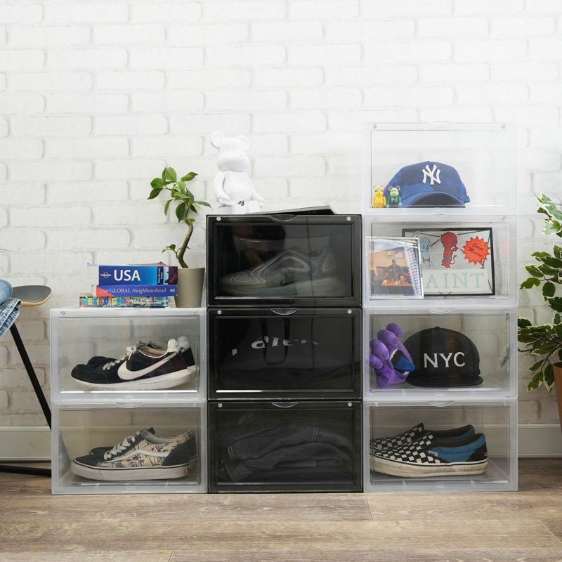 組み立て式ディスプレイボックス。 お気に入りを集めたコレクションケースに。 グッズを飾ってディスプレイボックスに。 中身が見えやすい透明度の高いフタはマグネット付きでパチッと閉じられます。 靴対応サイズ:31cmまで対応(靴の形状により 入らない場合があります。)