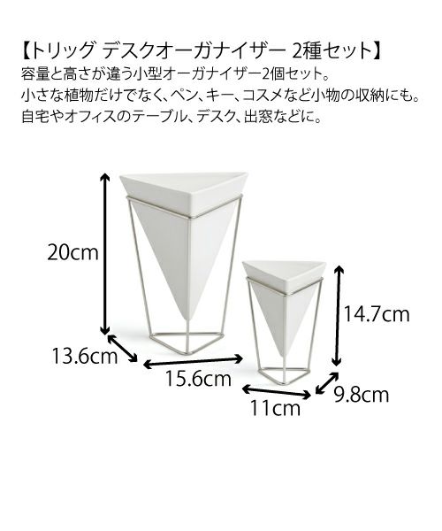 容量と高さが違う2個セットなので、自由にレイアウトしてディスプレイすることができます。複数を組み合わせてモダンなミニガーデンを作ることも、トリッグ デスクオーガナイザーの楽しみ方のひとつです。