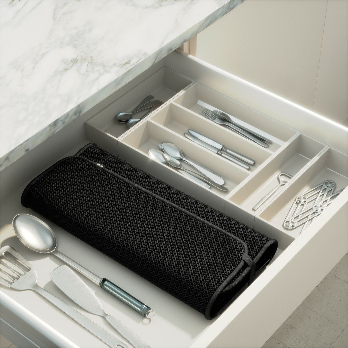 ユードライは、使用しないときは、コンパクトに折りたたんで食器棚に収納し、カウンターをすっきりさせます。