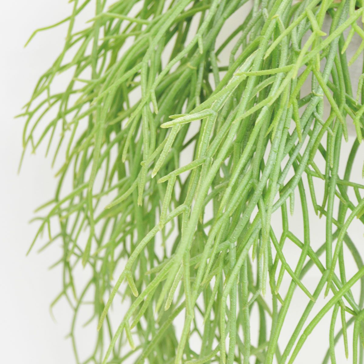 フェイクの観葉植物。 ハングタイプで、フックや天井に吊り下げできます。 時間が経っても枯れることがないため、いつでもお部屋の雰囲気をフレッシュに保てます。 気軽にグリーンを楽しみたい方はもちろん、日当たりのよくない屋内にお住まいの方や植物を育てるのが苦手な方にもおすすめです。 ハンドメイドで生産しておりますので、サイズや見た目も若干ばらつきがございます。あらかじめご了承ください。 フェイクグリーン 水やりや日当たり、風通しなどの室内環境の心配もなく、根腐れや通気不足、土の中のカビ、水のやり過ぎ、根詰まりなどが原因で枯れることもありません。 また、フェイクグリーンはインテリアアイテムとしてだけでなく、風水上でも運気を高めてくれるとされ、置き場所や飾り方を意識する方も少なくありません。 緑は「健康運を上げる」とされ、観葉植物のグリーンは空間にある負の気を吸収してくれるとも言われています。 そのため、人が集まりやすいリビングや玄関、頻繁に使用するトイレなどに置くと良いと言われています。 リプサリス 【特長・概要】 リプサリスは繊細な茎を次から次へと多方向に伸ばす、サボテンと同じ多肉植物です。 リプサリスという名前は、ギリシャ語で枝編み細工という意味に用いられる「rhips」が由来しています。学名は「Rhipsalis」となります。 リプサリス・ラムローサの和名である「梅が枝」は、小枝の姿が梅の枝に類似していることから付けられました。 また、リプサリス・ピロカルパという品種には、フロストシュガー、朝の霜、髭赤葦という別名があります。