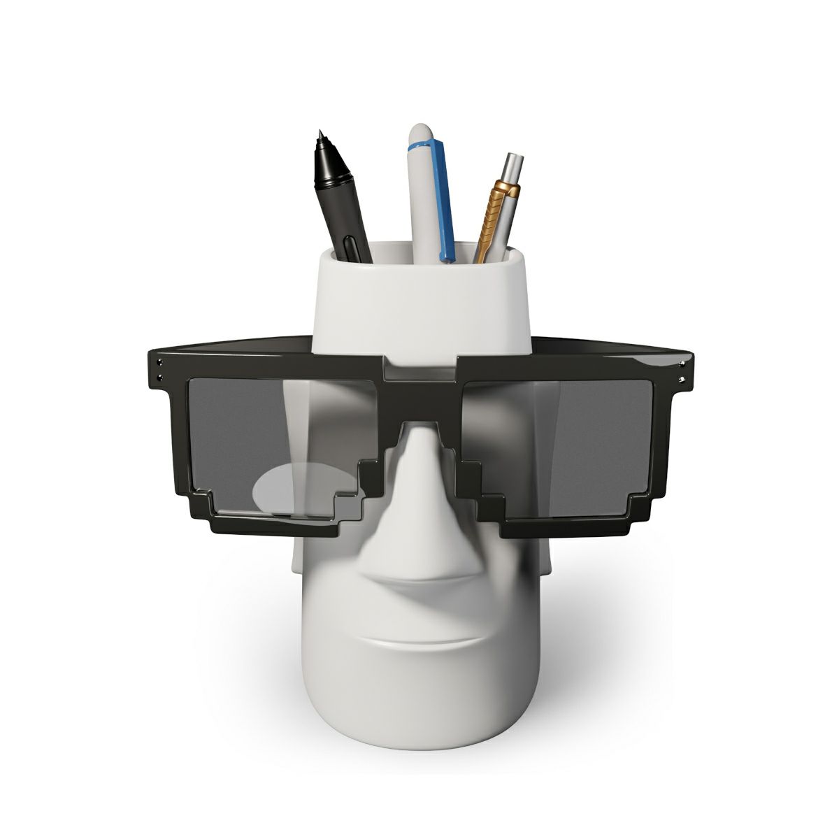 モアイがデザインされたユニークなペンスタンド。 筆記具を立てて置くのはもちろん、コスメのツールスタンドや、カトラリースタンド、メガネスタンドとしても活躍します。 特徴的な大きな鼻はメガネホルダーとしてお使いいただけます。