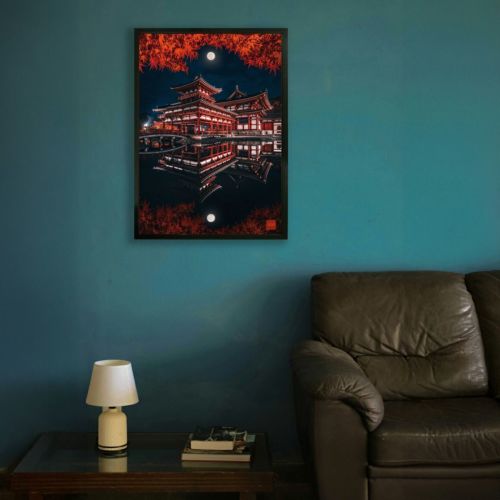 Byodo-in Phoenix Hall and its reflection in Aji Pond illuminated by the autumn full moon.