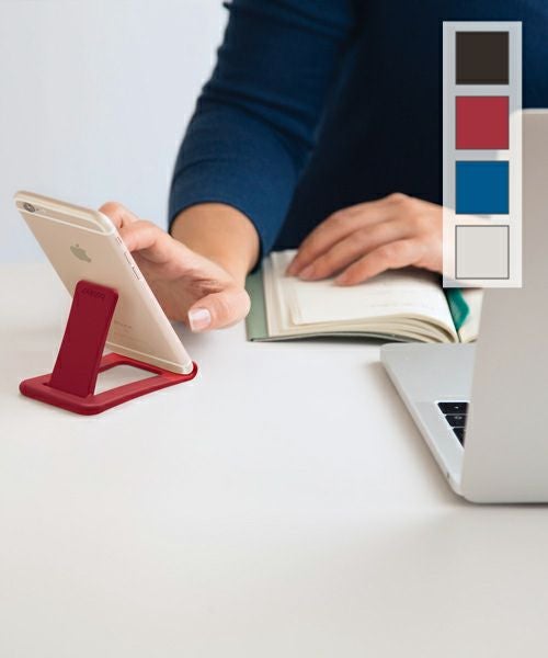 底面と接地面が滑り止め仕様になっているため、バーを持ち上げるて携帯を置くだけでしっかりと固定されます。好きな角度に調節できるので横置き縦置きのどちらにもお使いいただけます。こちらは折りたたんで持ち歩けるスマートフォンスタンドです。