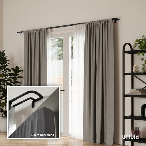 トワイライトは革新的なラップアラウンドデザインを採用しており、カーテンやカーテンパネルを壁に直接置くことで光漏れを防ぎます。 パネルをロッドの湾曲した端に巻き付け、ブラケットの後ろに押し込むと、外部の光が侵入するのを防ぎます。