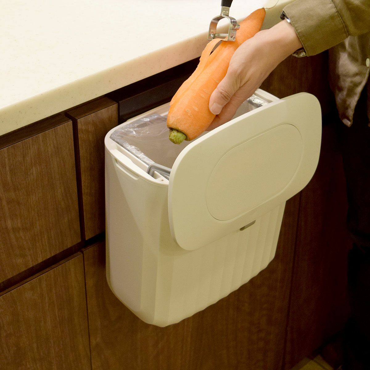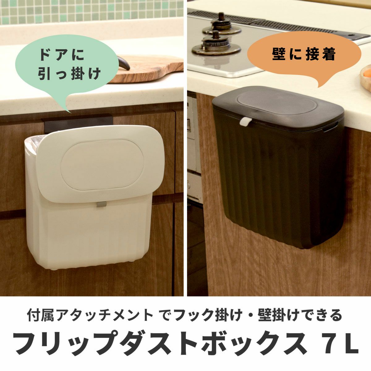 フタの開き方が2通りのダストボックス。 アジャスターを使い分けることで、キッチン扉に設置したり、両面テープで壁面に取り付けることも可能です。 両面テープでのアジャスターを使用した場合は、耐荷重約1.5kgです。 ドアフック用アジャスターを使用する場合は、厚さ2.5cmまでの扉に対応しています。 袋留め付きで、フタを閉めたときに袋が外から見えません。 容量7Lなので、キッチンのドアに取り付けて生ゴミ用のダストボックスや、デスク周り、洗面所、トイレなど幅広くご使用いただけます。
