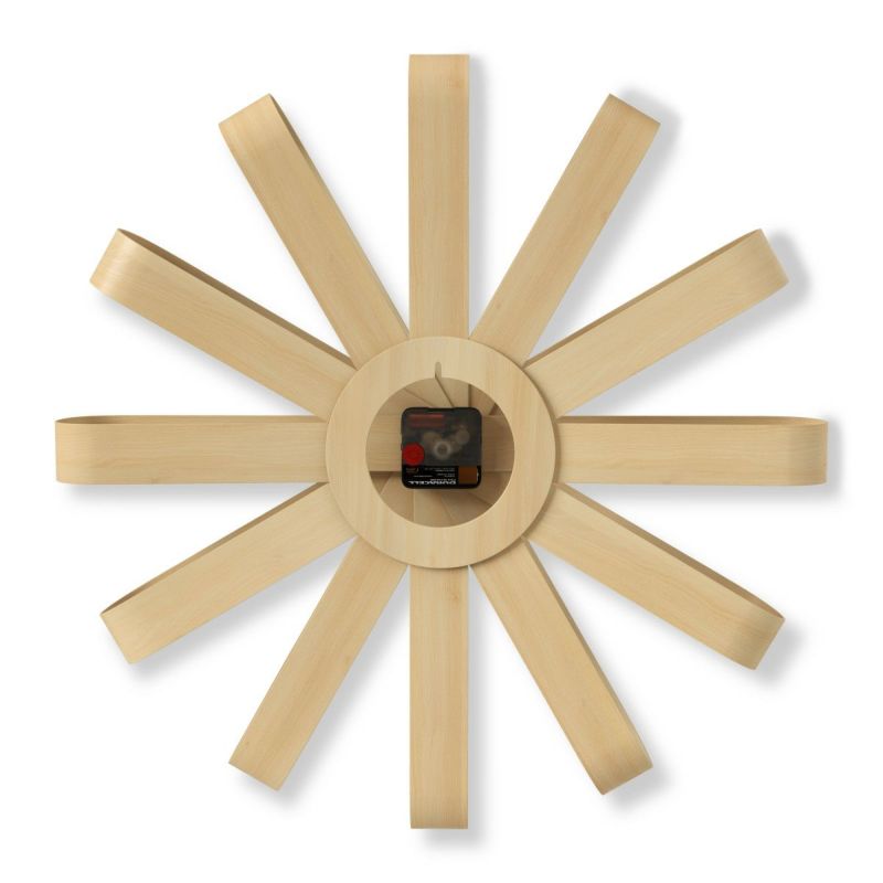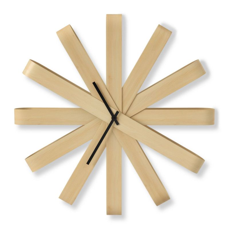 一枚板を曲げて作った綺麗なリボンの形が特徴のリボンウッド ウォールクロックは、軽くてデザイン性のある壁掛け時計です。