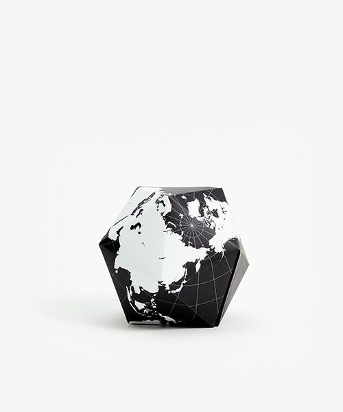 バックミンスター・フラーが特許を取得した世界地図「ダイマクションプロジェクション」。AREAWAREはフラーの平面地図を三次元に表現出来る折り畳み式の地球儀を作りました。