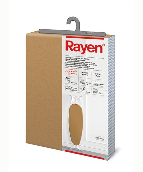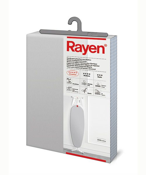 フェルト、クッションフォーム、コットン、アルミニウムの4 層構造のアイロンカバーです。 カバーのコットンにアルミコーティングを施したため、熱伝導性に優れ、効率よく作業ができます。また、熱の反射効率が高く、両面プレスの効果があります。 縁にゴムが入っているので、Rayenアイロンボードラージ・スモールどちらにも対応します。