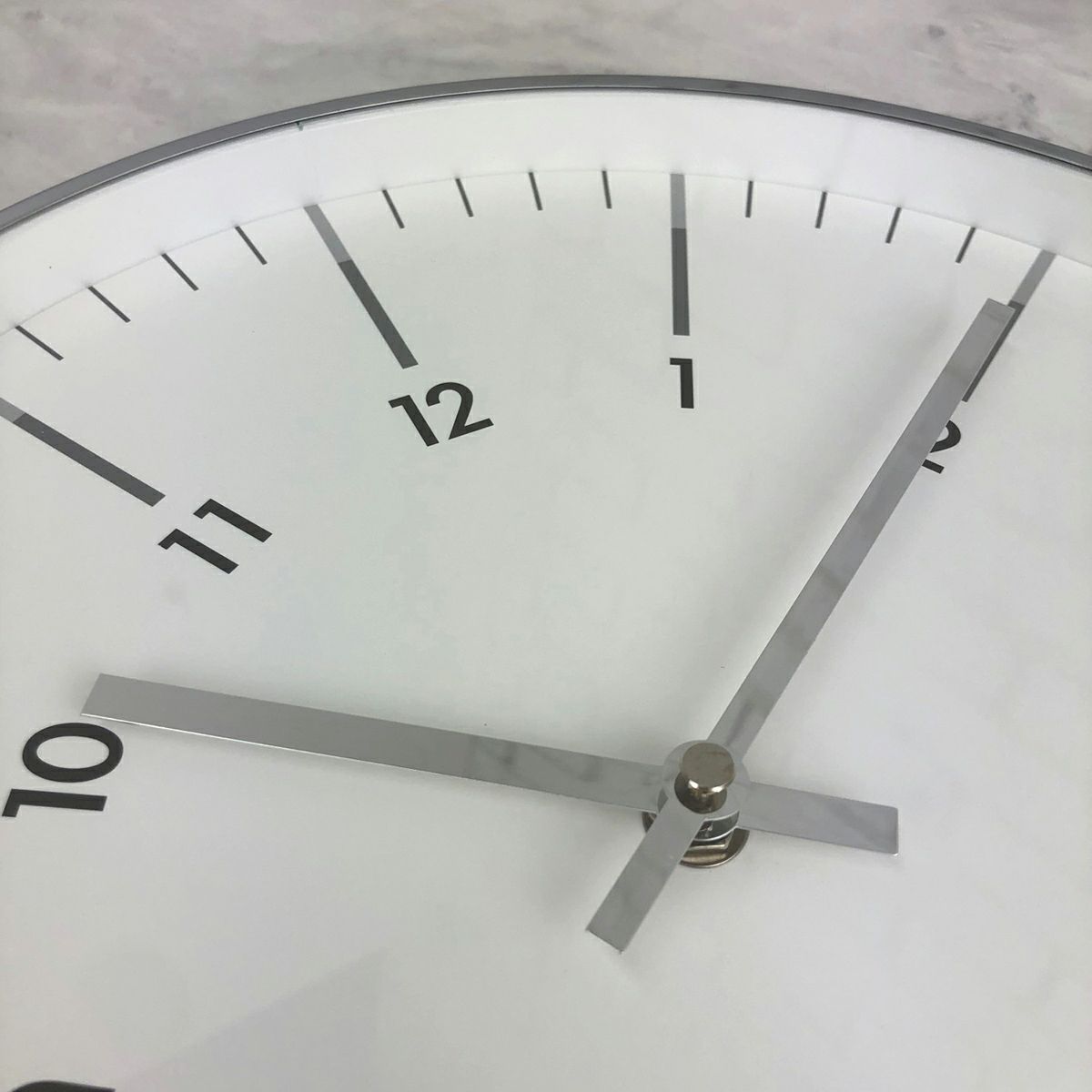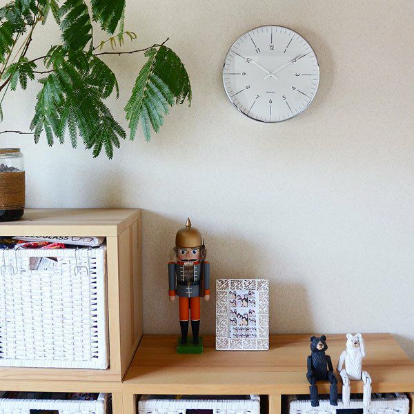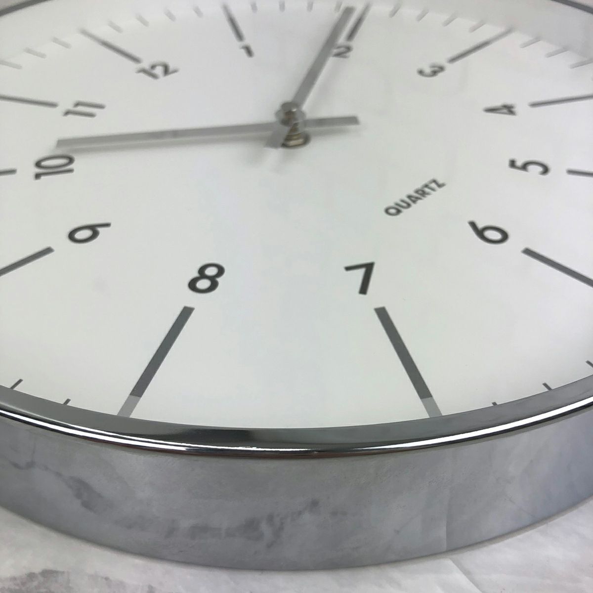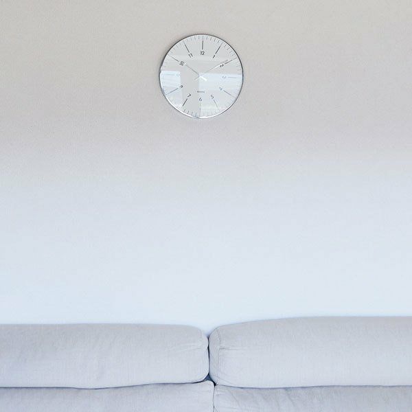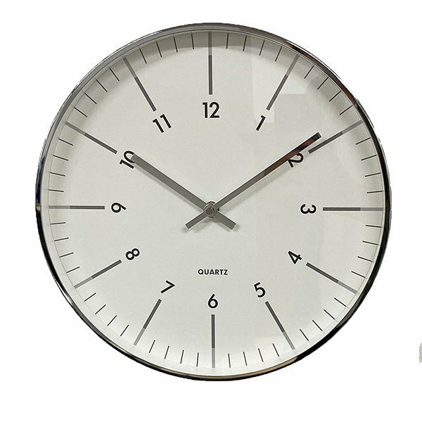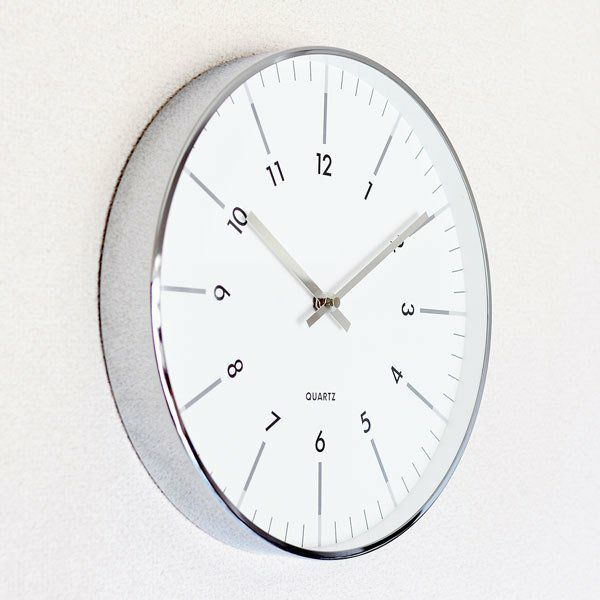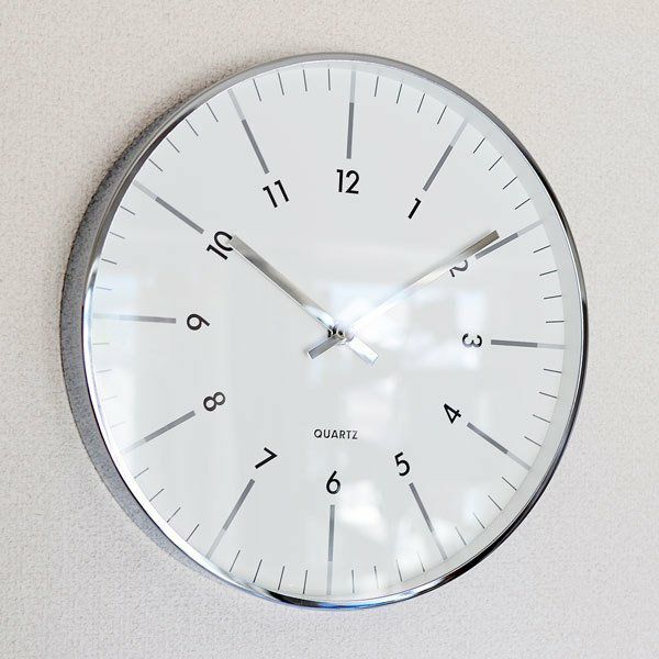 放射状に数字が傾けられたスタイリッシュなデザインの掛け時計です。 縁と針はシルバーメタルで、文字盤はガラスで覆われています。 シンプルなデザインですので、ご自宅だけでなくオフィスでのお使いにもおススメです。 秒針はありませんが、時計のムーブメントはステップ式です。 ※ご使用の際は単3電池1本が必要です。(別売)