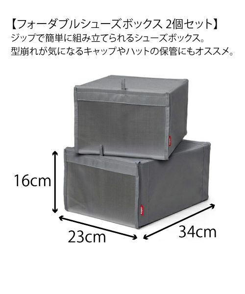 裏面のジップを閉めるだけで、簡単に組み立てられるシューズボックス。 表面にメッシュの窓があり、通気性がよく中を確認できます。 シューズの他に型崩れが気になるキャップやハットの保管にもオススメ。