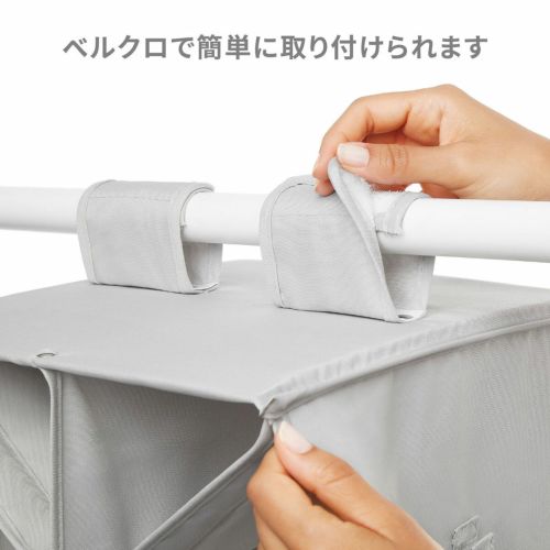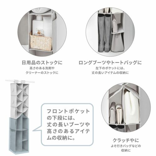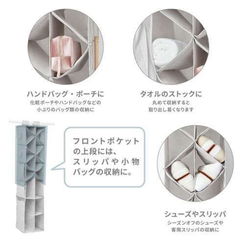 シューズやスリッパ、バッグなどの収納におすすめする吊り下げ収納。 サイズの異なるポケットが充実しているため、スペースを有効に使えます。 クローゼット内のポールにマジックテープで留めて固定します。 ●フロントポケット17個 ●サイドポケット6個 ●サイドフック4個