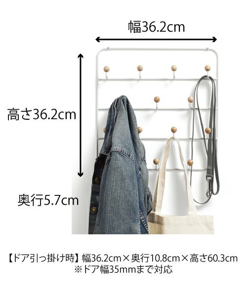壁に取り付け、ドアに取り付けが選べる2WAYのフック兼収納グッズ。ウッドとスチールのシンプルな素材でインテリアに溶け込みます。