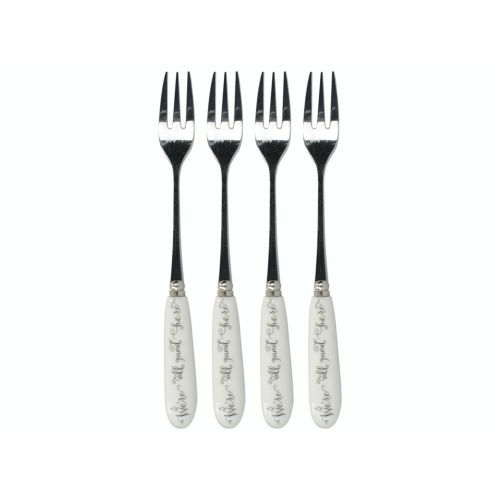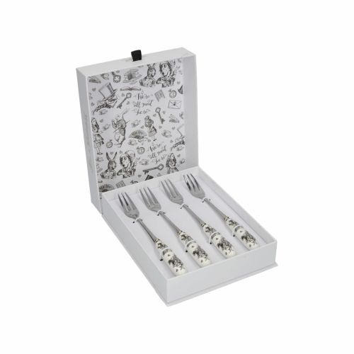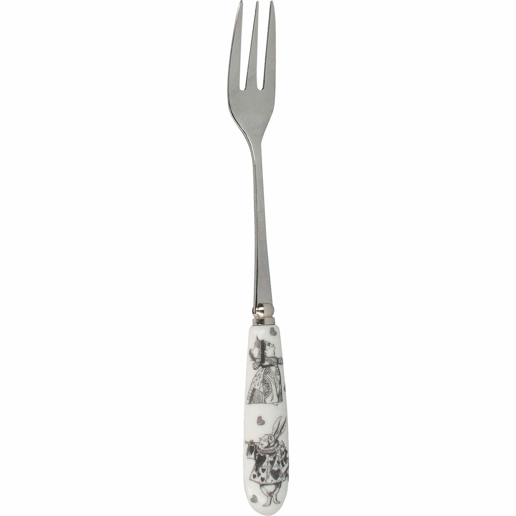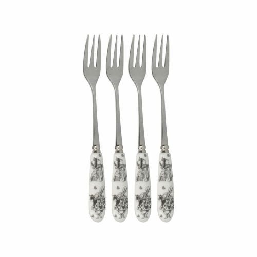 デザインは、サー・ジョン・テニエル(1820年 - 1914年)のアートワークに基づく『アリス・イン・ワンダーランド』のカードゲームからインスパイアされています。ハートの女王が悲鳴を上げている様子(「首を取り去れ!」)や、ホワイトラビットがトランペットを吹いている様子が見られます。アイコニックな引用「We’re all mad here」が裏面に美しい筆記体で印刷されています。これらの小さなフォークは、錆びにくく、腐食に強く、香りを吸収しにくく、簡単に汚れない高品質のステンレス鋼製です。ケーキや美味しいジャムタルトを食べるのにちょうど良いフォークです。