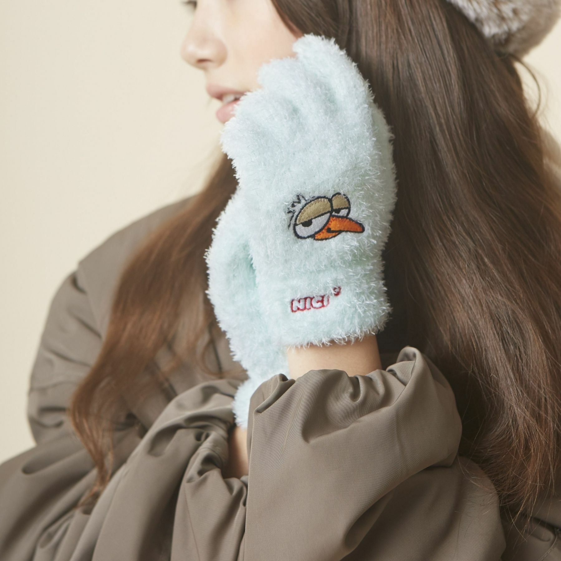 優しいカラーとNICIのキャラクター刺繍がアクセントの、肌触りのいい素材を使用したあったか手袋。