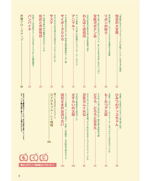 懐かしい昭和のアニメ番組の最終話を余すところなく紹介。1960年代を中心に30作品以上を掲載。エイトマン、ジャングル大帝、サイボーグ009など大人気アニメが大集合!