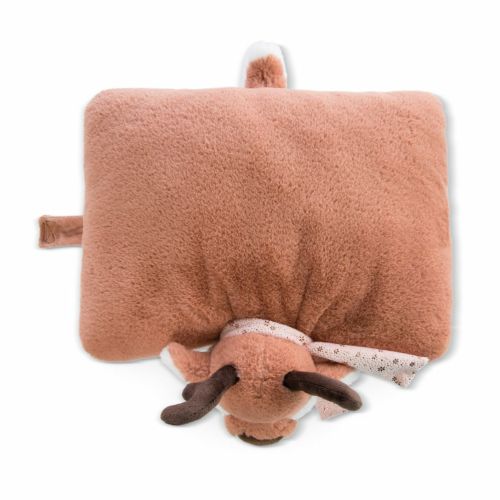 折り畳めばぬいぐるみのような立体形のピロー(まくら)になり、マジックテープを外せば広げてシートクッションとして使用することもできます。