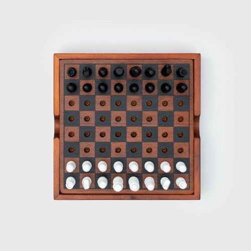 おなじみのチェスがコンパクトな木製で 登場!チェッカーでも遊べます。