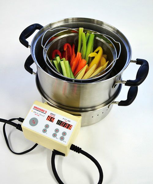 低温蒸しは、実際にやってみて慣れてくるととても簡単なのですが、食材を低温でジックリと蒸す間の火加減の調整や、蒸し上がるまでの時間が空き時間となってしまう事で、興味を持っても、いざ始めるのに抵抗を感じる方も少なくありませんでした。 装置をもっと簡単に。 それを解決してくれるのが、ご紹介する「平山式低温スチーム電気鍋」です。私が開発した、この鍋を使用すれば、劇的に「低温スチーミング」の敷居が低くなります。コントロールボックスで「蒸し温度」「蒸し時間」を設定する事ができるので、食材を入れてスイッチを入れるだけで簡単に「低温スチーミング」をする事が可能になります。みなさんも、是非「低温スチーミング」を実践してみてください。みなさんの食生活がより豊かで楽しいものになっていただけることを願っています。平山式 低温スチーム鍋で、 簡単に低温蒸し生活がはじめられます!!