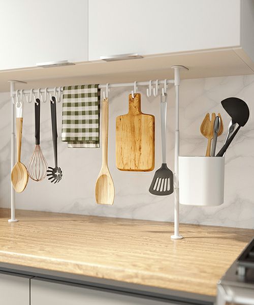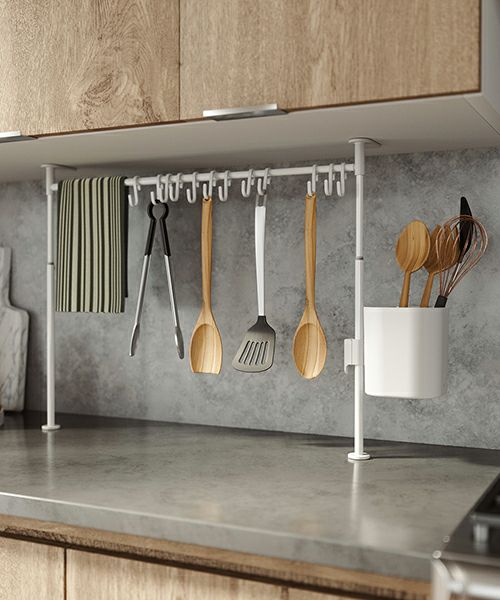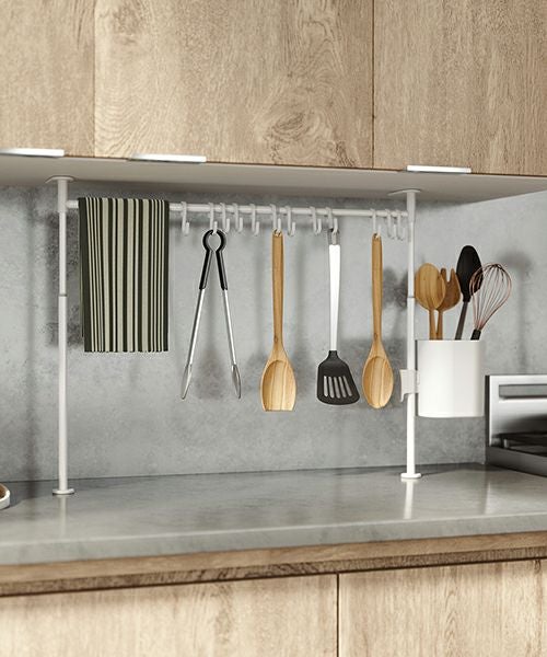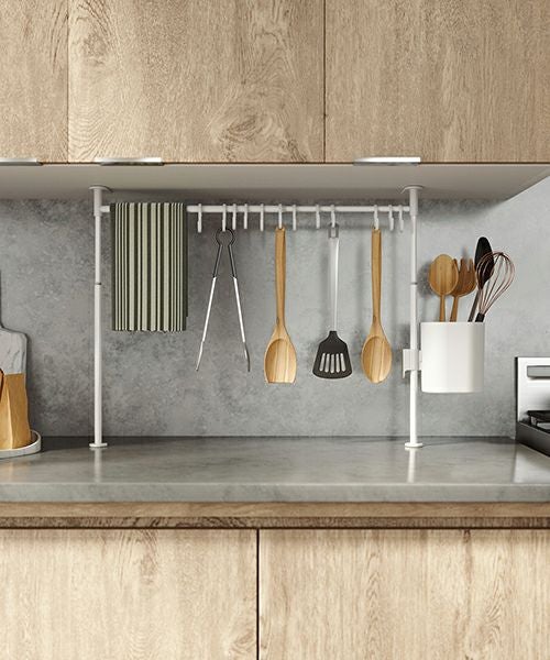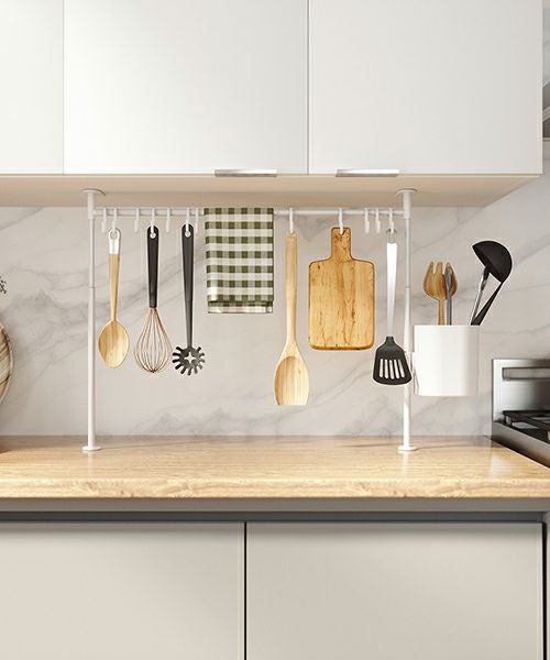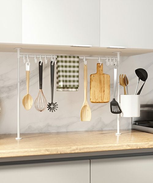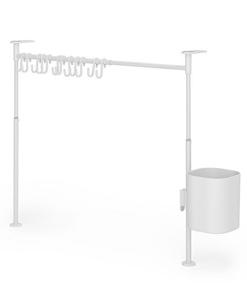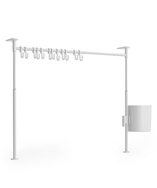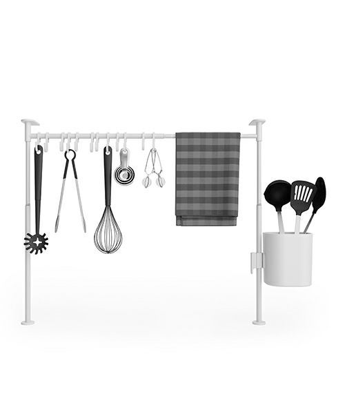 使用頻度の高いキッチンツールを手に取りやすくするテンションオーガナイザーです。 キッチンをはじめ、バスルームやオフィスで整理するのに役立ちます。 テンションロッドは、スペースに合わせて調整可能で、高さ38-50 cm、幅45-61 cmに調整できます。 取り付けに工具や穴あけは必要がないので、突っ張り棒の容量でお使いください。 また、テンションロッドの先端にソフトグリップパッドがついているので接合面の摩擦を軽減し、キズをつけにくい仕様になっています。 付属品:オーガナイザー×1(上下に調節可能)、フック×12