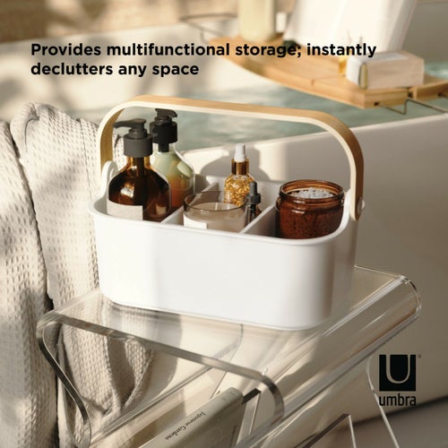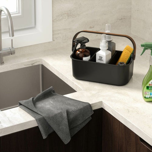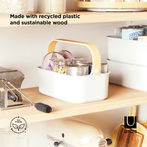 リサイクルプラスチックと再生可能な木材で作られています。ハンドル一体型で持ち運びが簡単。シリアルボックスにちょうどいい35x26cmサイズと、スナックやスパイスなどを収納できる28x17cmサイズの2サイズ展開です。