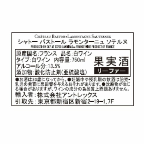 タイプ:白(貴腐) 甘辛度:甘口 原産国 : フランス ぶどう品種:セミヨン80%、ソーヴィニヨン・ブラン20% 特徴:2014年にエコサート認証を取得。 バランスが良く、鮮やかでありながら繊細な貴腐ワインです。 柑橘系の香りとコンフィオレンジやドライアプリコットのアロマを お楽しみいただけます。