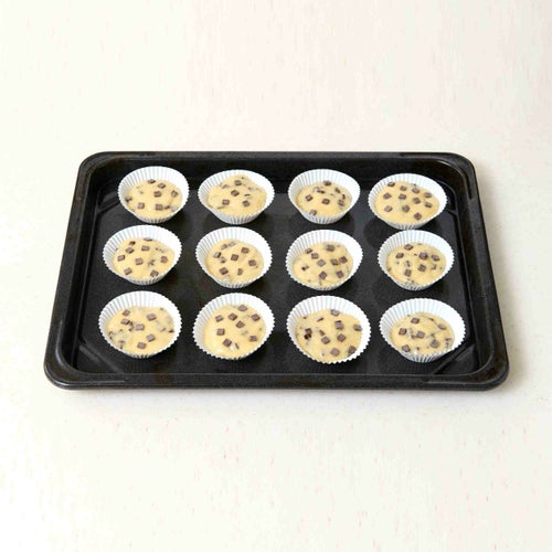 ⑤ 天板にマフィンカップ12個を並べて、生地を均等に流し入れ、③をトッピングする。